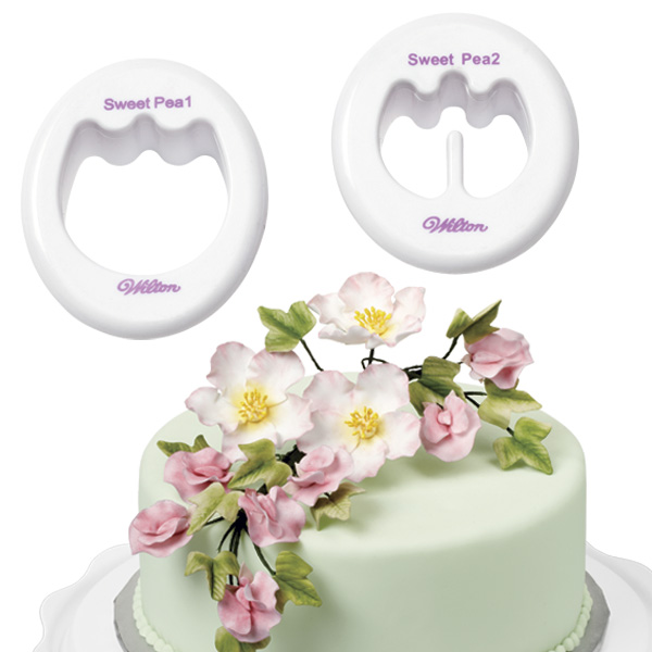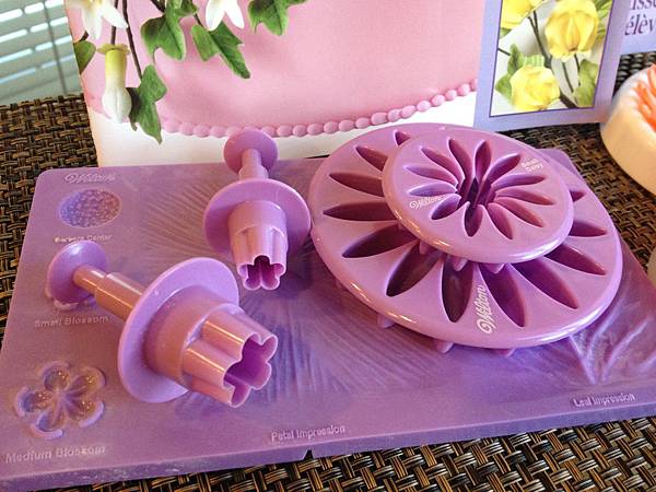 將小團翻糖桿平,用上方的類似注射器切出花型,對準花的紋路按壓,
