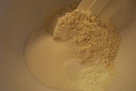 3. 取一攪拌盆混合乾性材料(2 cup 麵粉、砂糖、泡打粉及鹽)