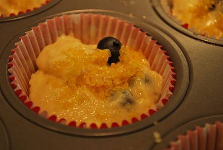 7. 將麵糊均勻填入瑪芬紙模中,灑上步驟2檸檬糖頂