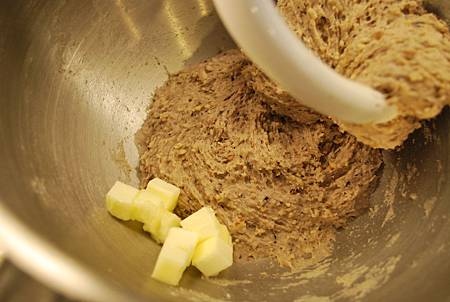 4. 成團後慢慢加入室溫奶油,再攪打約15~20分鐘,至可撐起薄膜的狀態