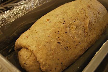 6. 取出麵團,將麵糰排氣整形,桿成長方形後捲起成圓柱狀,收口朝下置於抹油的9x5'長方形烤模
