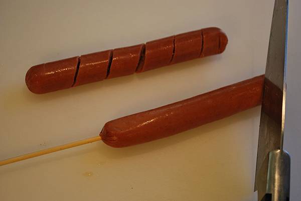 1. 以竹籤串於熱狗中心,從頂端斜角入刀,深度約為碰到竹籤後停止,接著旋轉熱狗繼續切至底端