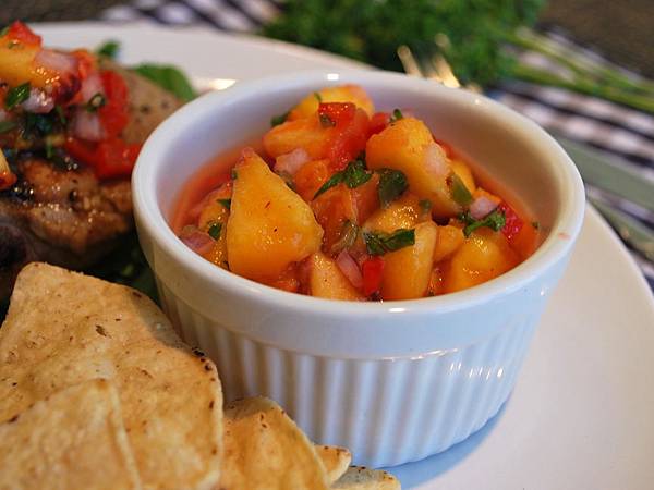 甜美的水蜜桃不只能當水果吃、烘焙甜食糕點,還能調和鹹味入菜,今天要介紹的就是美國版混搭墨西哥菜式的水蜜桃莎莎醬,利用水蜜桃的甜度與香氣,與甜紅椒、紅洋蔥、墨西哥辣椒一同浸漬融合,搭配炙燒豬排誘人的碳烤香氣,提供去油解膩又刺激味蕾的功效。