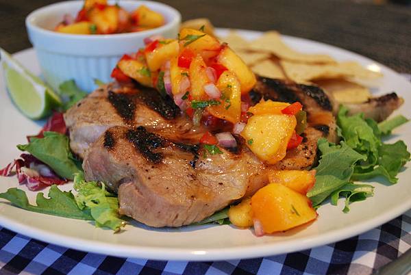 Step8. 豬排淋上水蜜桃莎莎醬,與沙拉葉、玉米脆片、萊姆片一同呈盤食用