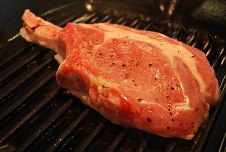 Step6. 預熱橫紋炙烤盤或烤肉架,放上豬排,一面烤5分鐘