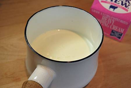 step10.製作巧克力甘那許:取一厚底小鍋將鮮奶油小火加熱至邊緣冒泡泡的微滾狀
