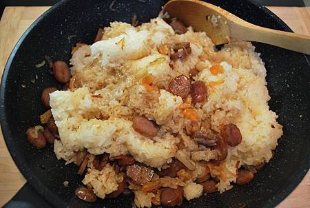 step11.熄火後加入步驟2蒸熟的糯米拌勻,一匙匙逐量淋上滷肉肉汁至喜歡的鹹度