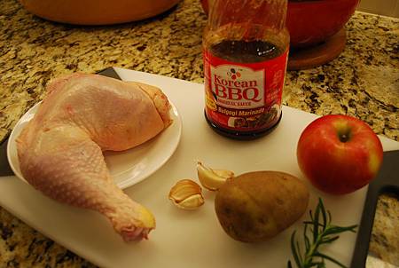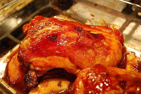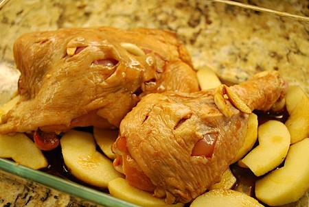 2. 以蘋果片墊底,雞腿刷上烤肉醬,進400度F烤箱烤30~40分鐘
