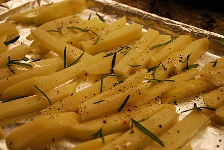 5. 薯條淋上橄欖油,灑上迷迭香葉、鹽與胡椒,一同入烤箱約20分鐘即可