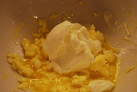 1. 奶油稍微打至鬆軟,加入雞蛋打勻,再加入優格拌勻