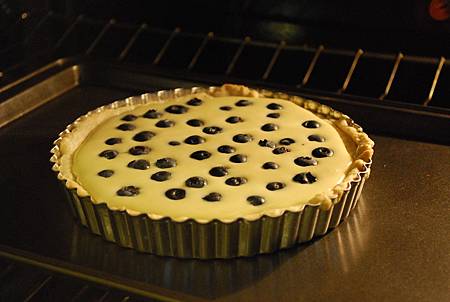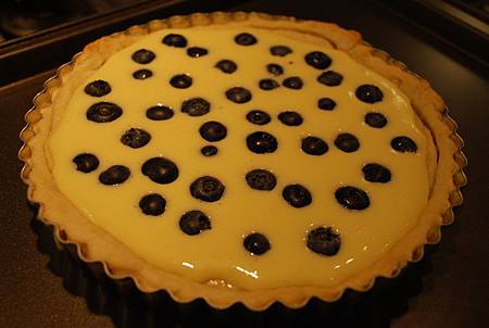 7. 將奶油乳酪液填入派皮當中,鋪上新鮮藍莓