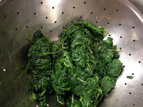 先將大量菠菜炒至水分蒸發,放涼後儘量擰乾,加入ricotta cheese(義大利軟質乳清乳酪)、