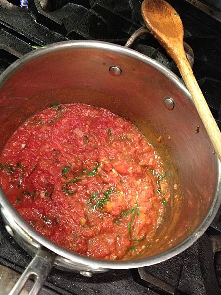 蕃茄羅勒醬顧名思義就是蕃茄加羅勒,先將洋蔥碎炒至金黃,加入蒜末及羅勒絲,