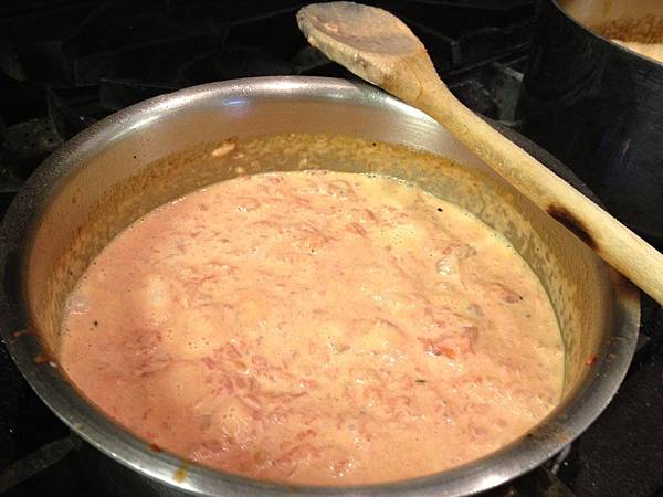 酒經揮發後,將醬汁收乾至一半,再加入切碎的罐頭蕃茄與蕃茄醬汁,加入鮮奶油增加乳香濃稠,
