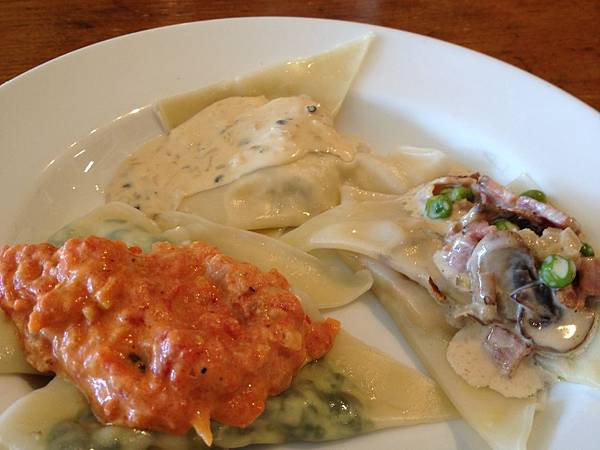 以下分別是伏特加蕃茄奶油醬搭菠菜義大利餃、奶油白醬搭乾香菇義大利餃,