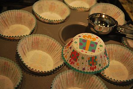 1. 烤箱預熱375度F,瑪芬模放上烘烤紙模
