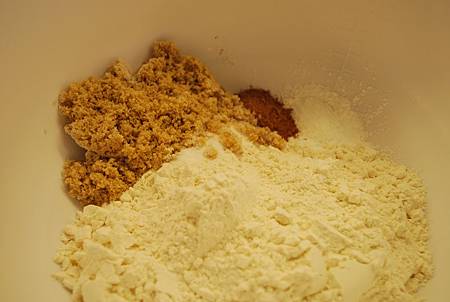 3. 取一中碗混合乾性材料(麵粉、泡打粉、棕糖、南瓜派香料與鹽)
