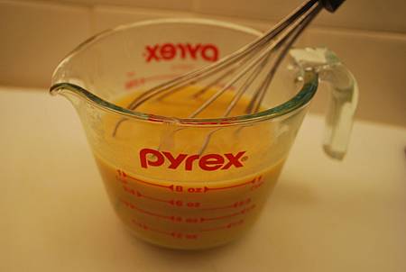 4. 取另一碗混合濕性材料(雞蛋、蛋奶酒、牛奶、香草精與融化奶油)