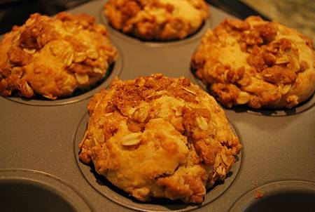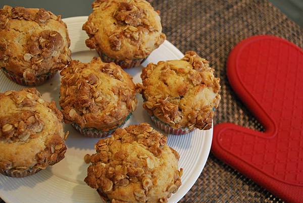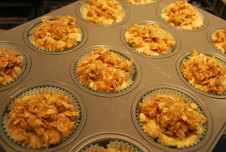 8. 將步驟6麵糊均勻填入瑪芬紙模中(建議使用冰淇淋勺),均勻灑上奶油酥頂