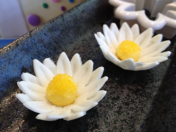 接著將兩片花瓣交錯重疊,取一小球黃色翻糖,沾黏上黃色sprinkle sugar糖粒,黏於花瓣中心。