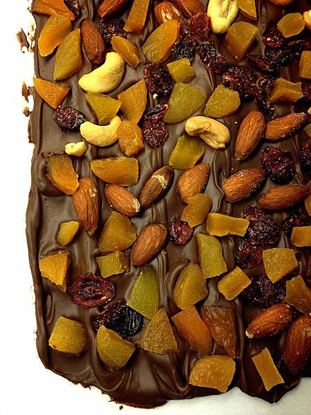 5. 趁熱灑上堅果及果乾,可從上方將很溫柔地堅果及果乾壓進巧克力中
